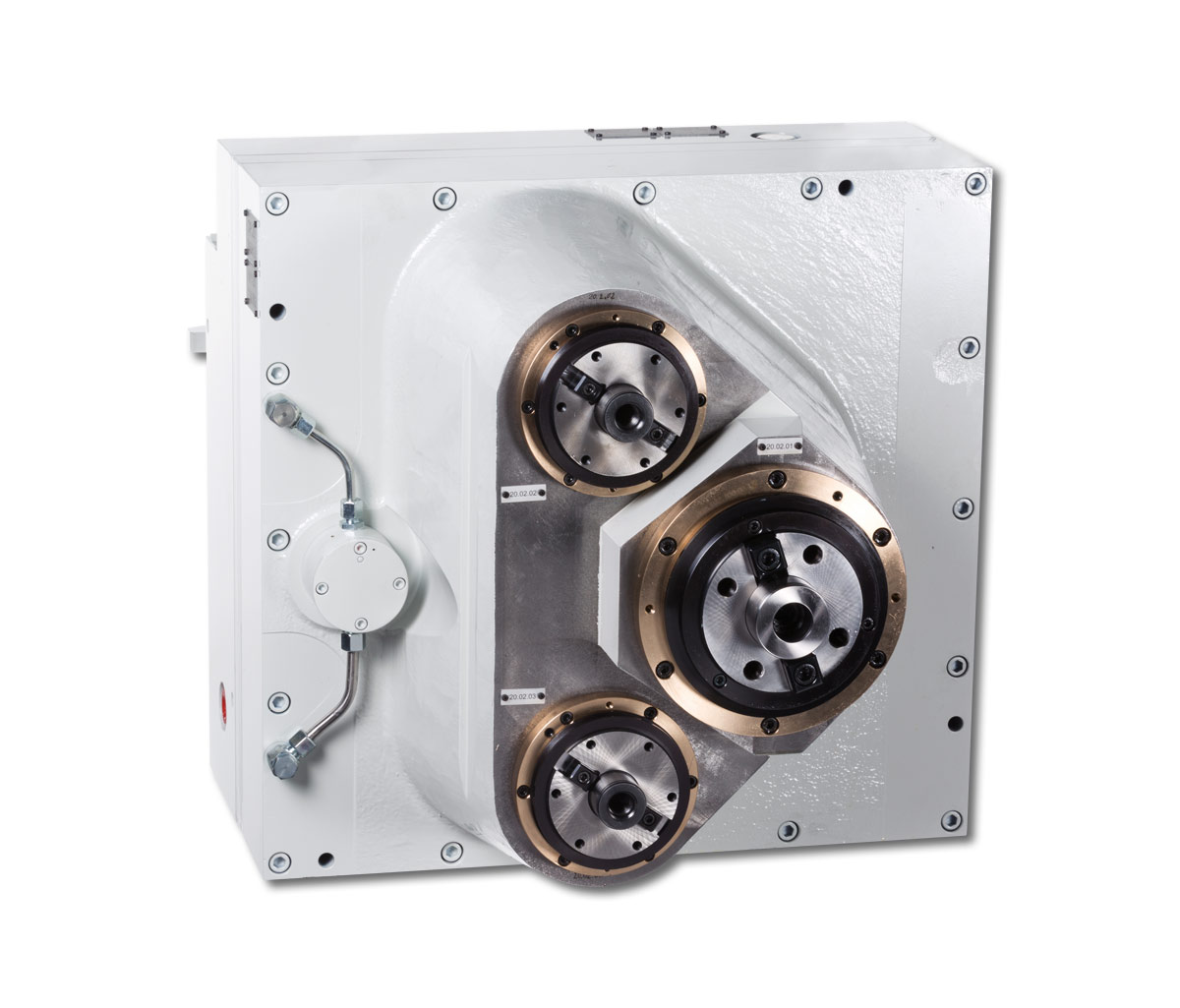 For HELLMERICH units with head change interface, the adapter including the drive is permanently mounted in the machine tool. The interface on the adapter is equipped with a central drive shaft and a manual or hydraulic clamping system. The unit with head-change interface consists of the gearbox and the bearing bores for DIN spindles. The setup process is done manually. Weight of changeable unit < 30kg.