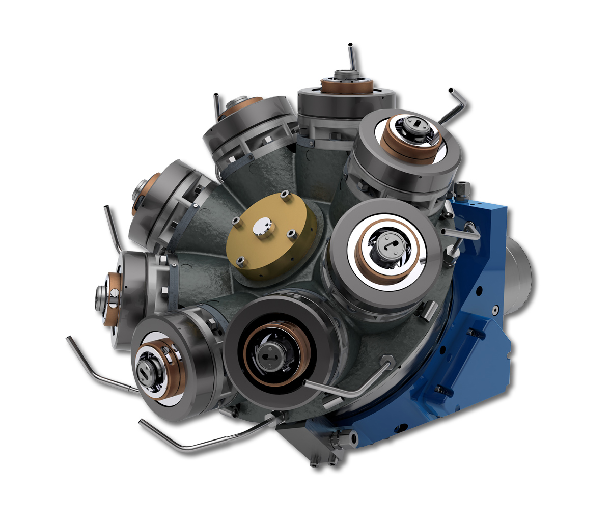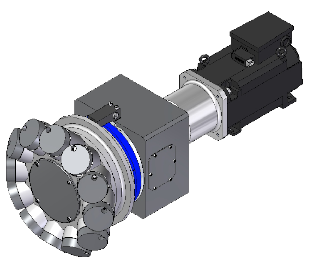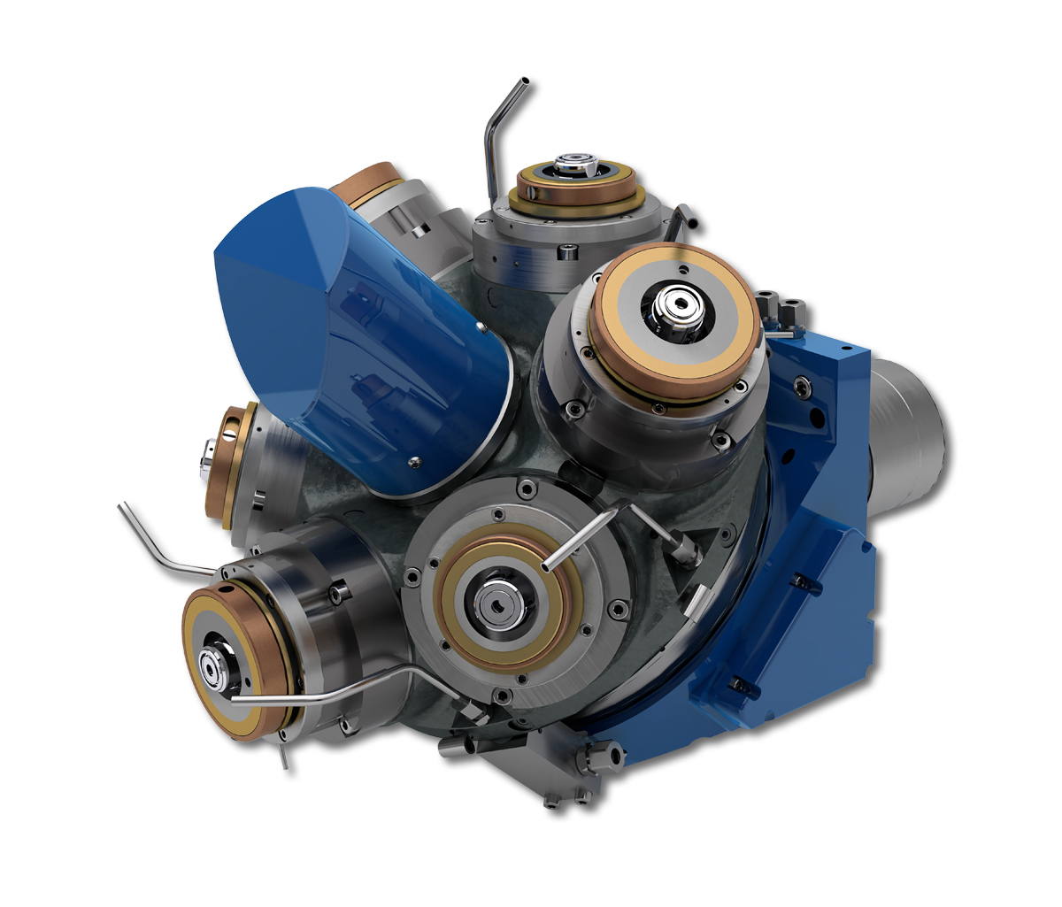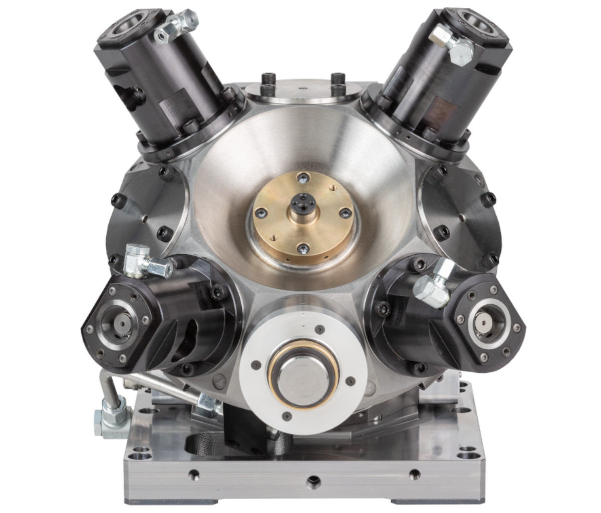 The Hellmerich crown turrets can be equipped with spindles and driven tools, such as multi-spindle heads or angular heads. Superstructures such as pneumatic grinding spindles are also available, as are VDI fixtures for rigid tools.